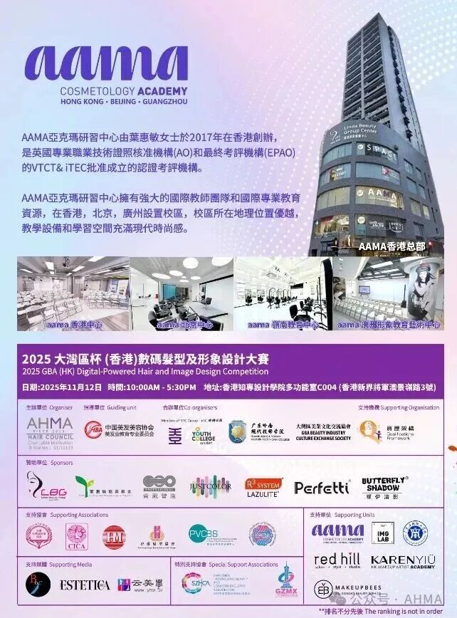 Organized by AHMA HAIR COUNCIL and guided by the Hairdressing Education Professional Committee of China Hairdressing and Beauty Association (CHBA), this competition has received joint support from the Hong Kong Design Institute, Youth College, Guangdong Lingnan Modern Technician College, and the Greater Bay Area Beauty Industry Cultural Exchange Association, as well as strong assistance from numerous renowned institutions.
