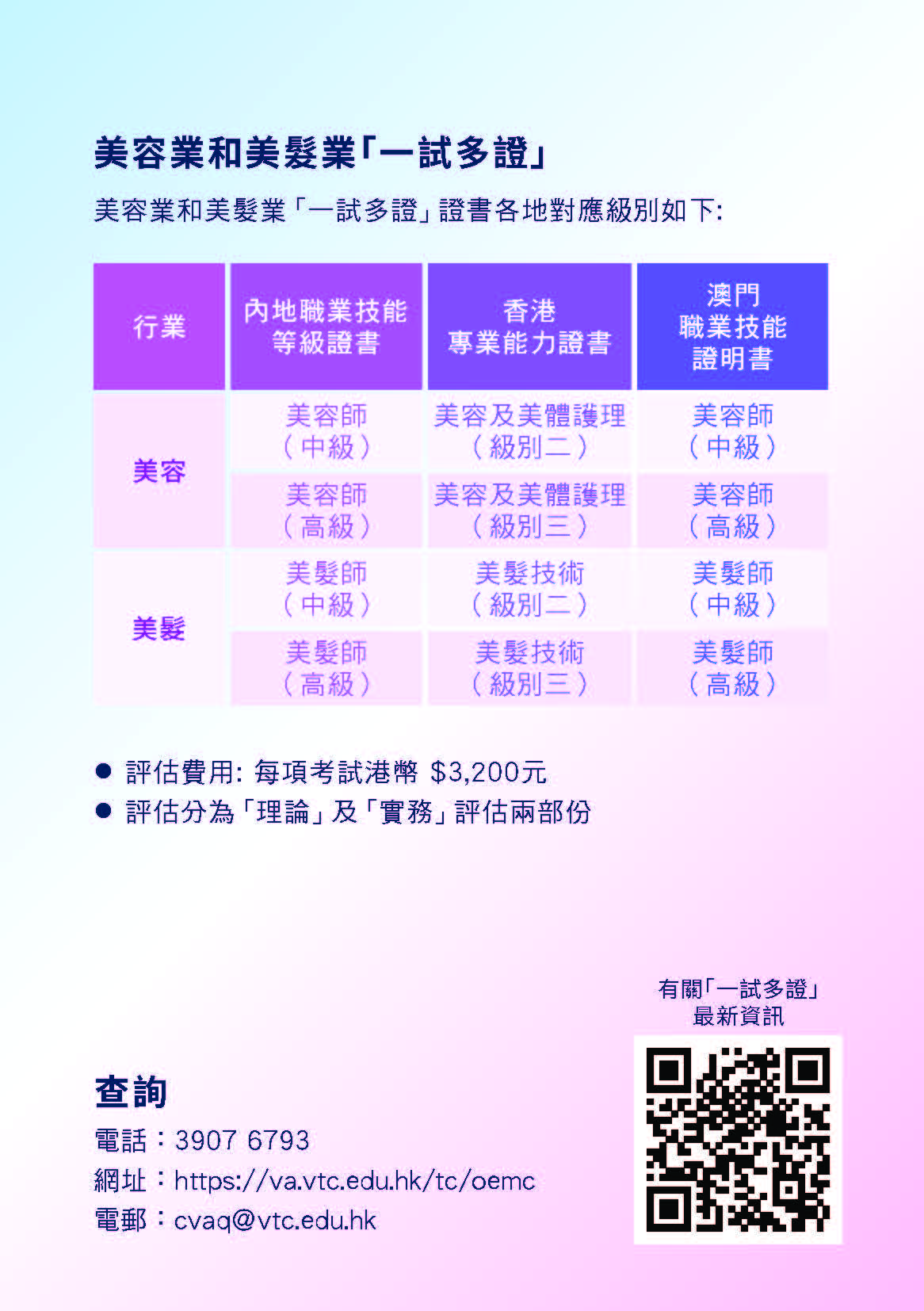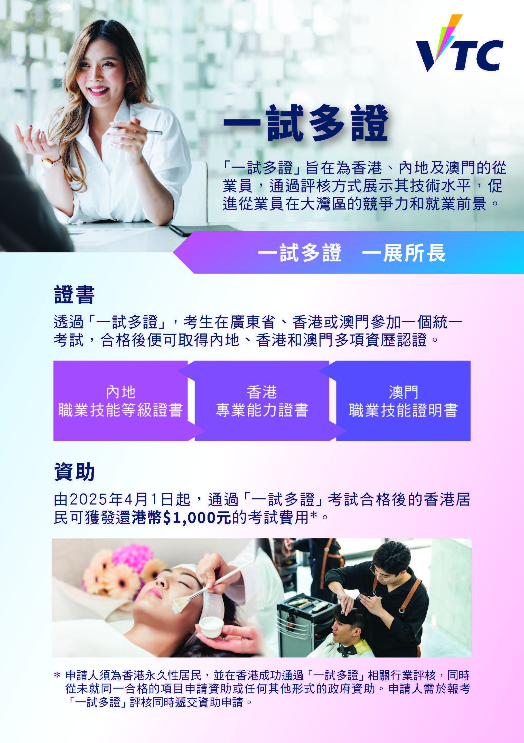 目前,已有美髮師、美容師、維修電工、設施管理師、餐廳服務員、客房服務員等行業參與了「一試多證」的評估,正在推行的行業有建造業,旅遊餐飲,工程科技,護理服務。
