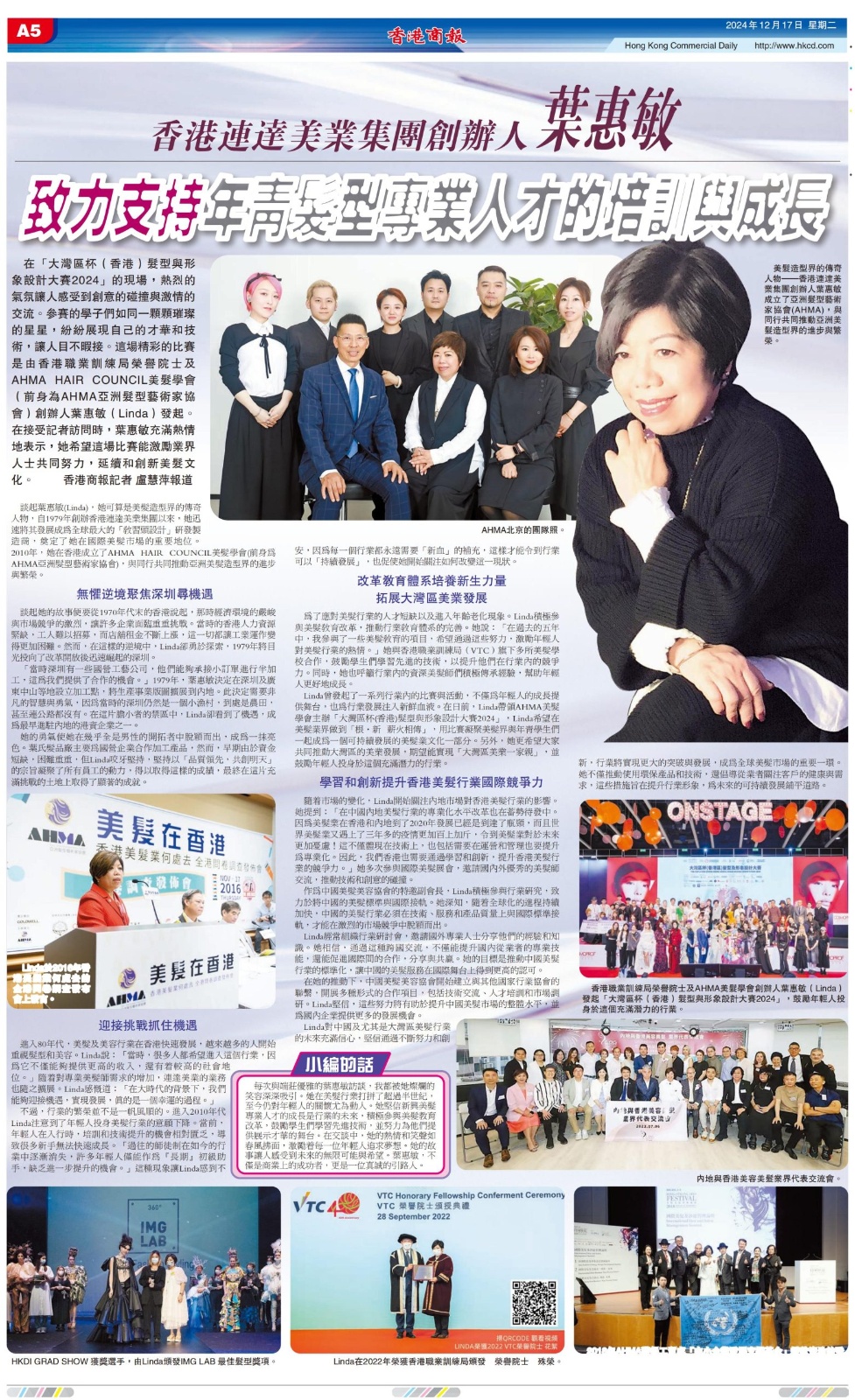 近日,AHMA Hair Council 会员、香港发学会(VTC)学院士Ms. Linda Yip 葉惠敏女士接受了《香港商報》的獨家專訪,暢談她在美髮行業的發展歷程,以及她對行業傳承與未來的深刻見解。 在專訪中,葉惠敏女士分享了自己的初心:“美髮行業的發展要根·新並進,薪火相傳。行業需要年輕一代的加入,傳承我們的技藝與熱愛,才能迎接未來的挑戰。”