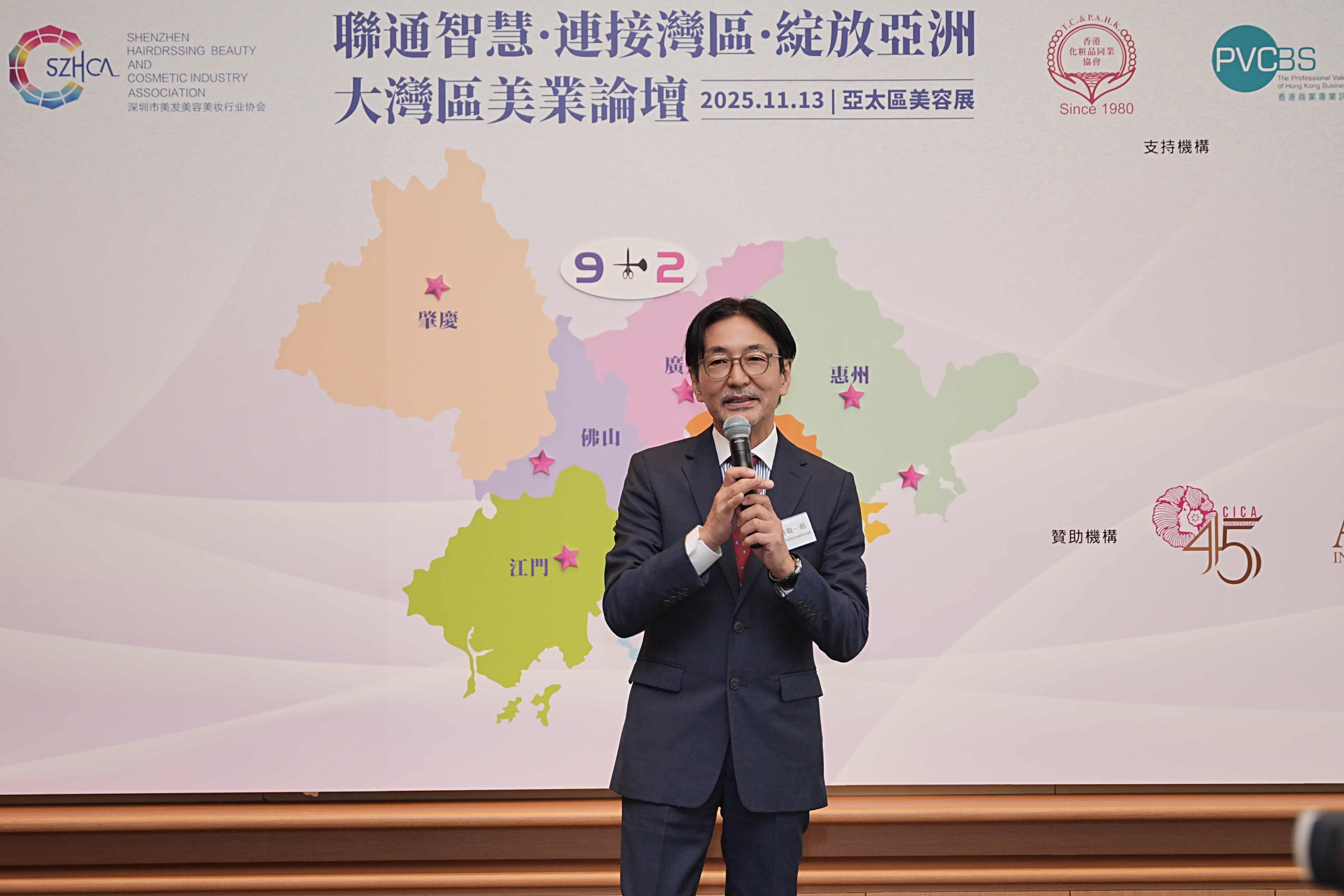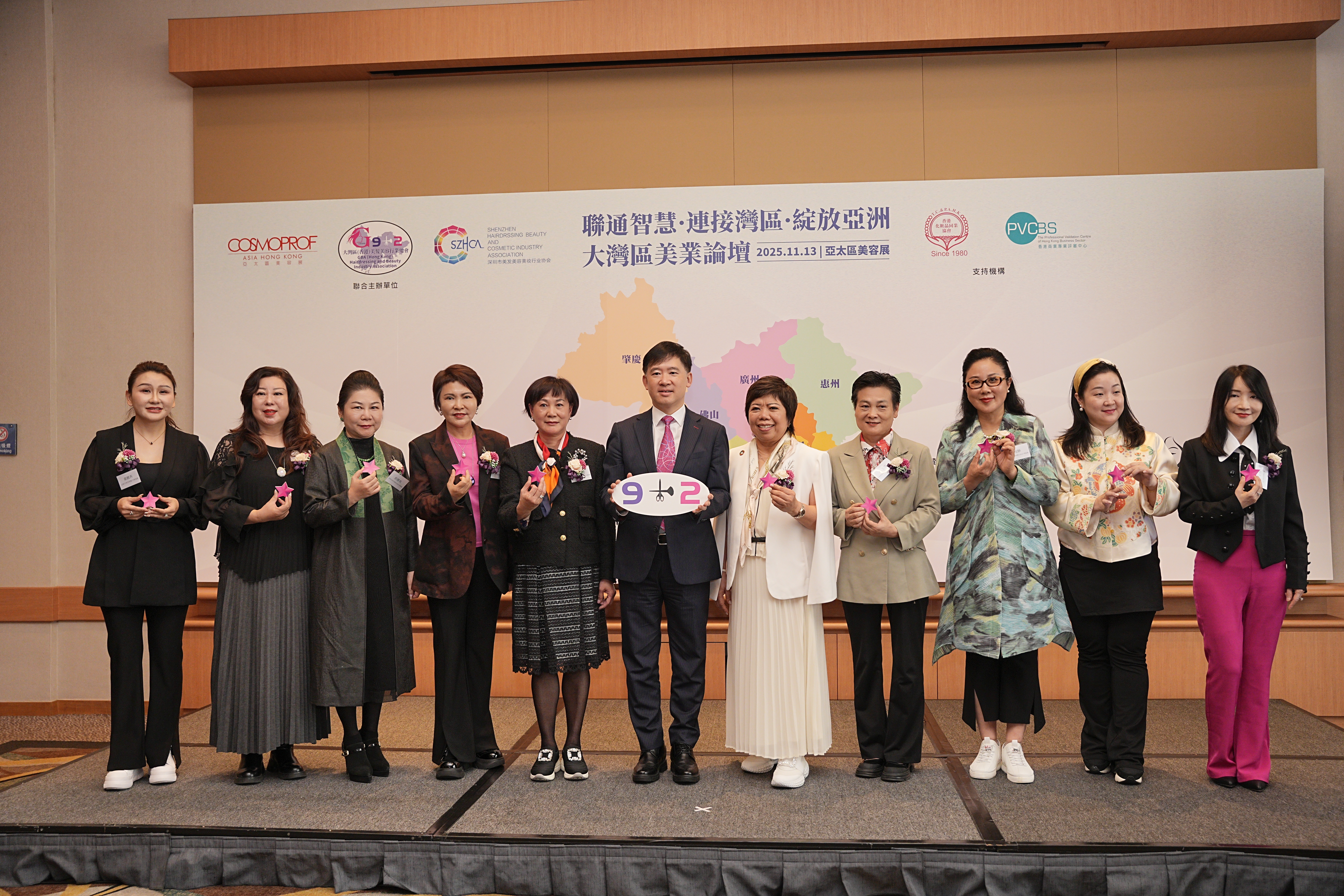 由大灣區(香港)美髮美容行業總會,深圳市美髮美容美妝行業協會、COSMOPROF ASIA聯合主辦的「大灣區美業論壇」在2025年11月13日於亞太美容展期間隆重舉行,論壇以“聯通智慧,連接灣區,綻放亞洲”。很榮幸地邀請到香港政制及內地事務局副局長胡健民先生,MH, JP擔任主禮嘉賓,聯同大灣區10位美業協會會長,舉辦了「大灣區 9+2 美業互動發展平台」啓動儀式,共同見證平台啟動,標誌著大灣區美容美髮產業首次建立「雙向通道」:既助港澳品牌開拓內地市場,亦協助內地企業通過港澳走向國際。